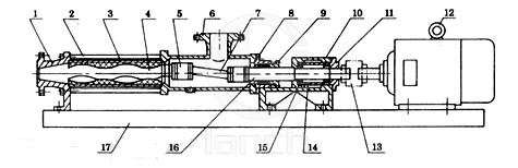 1 出料腔 2 拉杆 3 螺杆胶套 4 螺杆轴 5 万向节总成 6 吸入口体 7 连节轴 8 填料器 9 填料压盖 10 轴承座 11 轴承盖 12 电机 13 连轴器 14 轴套 15 轴承 16 传动主轴 17 底座