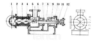 1 弯头接管 2 直筒 3 橡胶管 4 螺杆泵 5 三通泵体 6 石棉填料 7 填料压盖 8 绕轴 9 空心泵轴 10 泵座 11 销轴销帽 12 联轴器